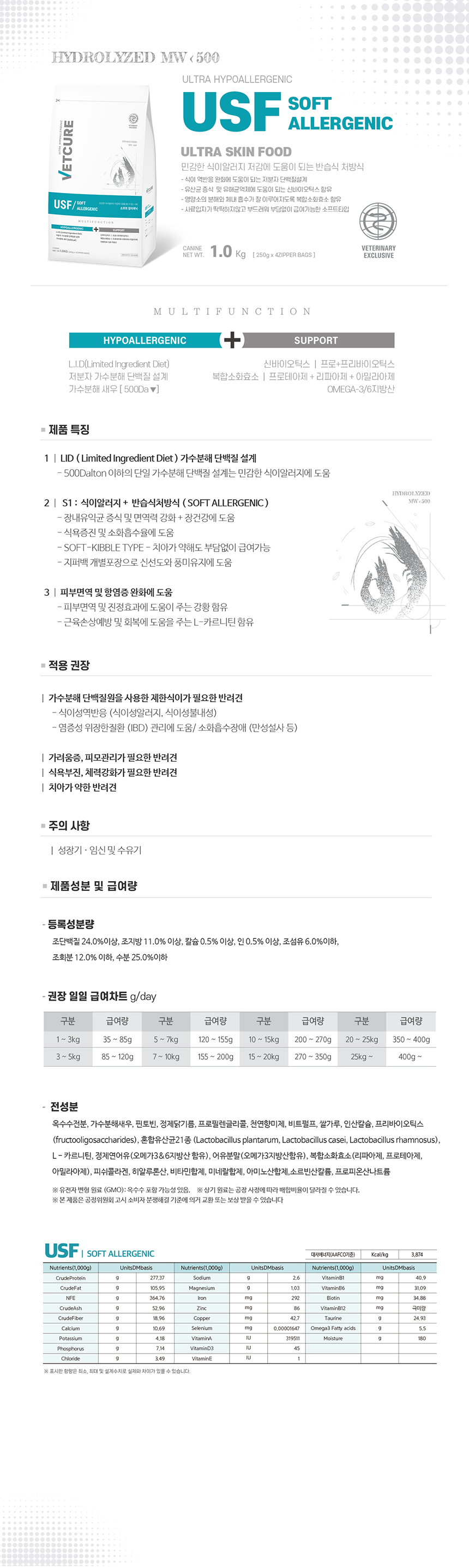 (DOG) 벳큐어 USF SOFT ALLERGENIC 소프트 알러제닉 (1kg) 식이알러지 유해균억제 가려움증 피모관리 체력강화에 도움